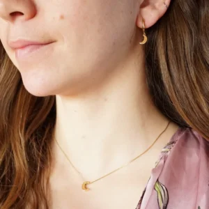 Para una experiencia completa de luna, Collar Luna también está disponible como parte de un conjunto que incluye los encantadores pendientes de luna a juego. Esta opción te permite coordinar tu estilo de manera impecable, llevando contigo la magia lunar en cada detalle. Los pendientes replican la forma celestial del colgante, creando un conjunto armonioso que eleva tu presencia con un toque celestial.